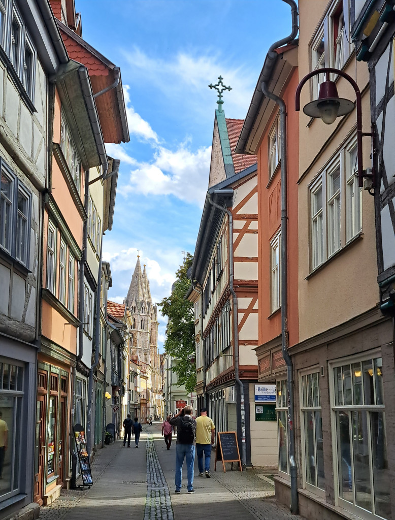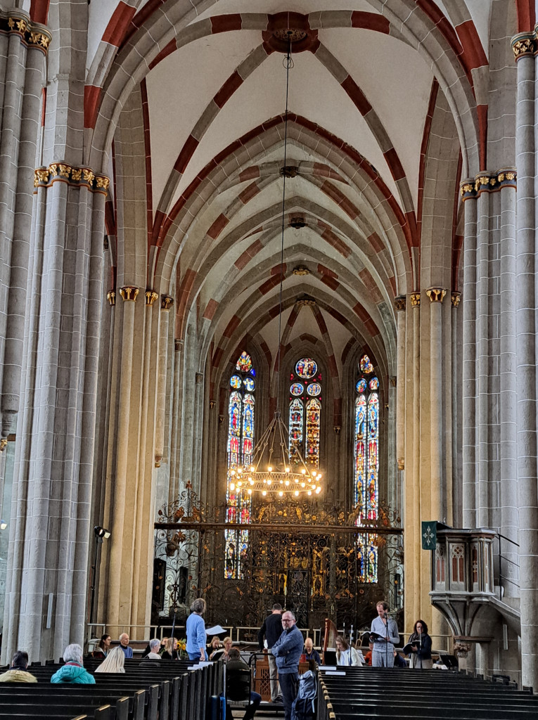 Bei einem kurzen Bummel durch die Altstadt kamen wir zur Divi-Blasii-Kirche, eine Kirche mit romanischem und gotischem Anteil, die nach wie vor als Kirche genutzt wird. Hier wurde gerade für die bevorstehende Uraufführung des Thomas-Müntzer-Oratoriums von Keno Hankel (Komposition) und Andreas Hillger (Libretto) geprobt.