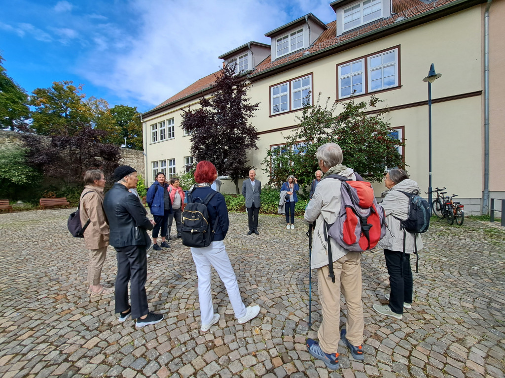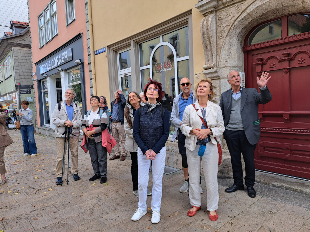 Ein Paar der bäuerlichen Bundschuhe diente ebenso als Exponat wie der hölzerne Schreibkasten Martin Luthers. Und zahlreiche Urkunden ließen uns erleben, dass diese Schrift nach 1500 durchaus heute noch gut lesbar ist.Zum Abschluss streiften wir erneut durch die Stadt, sahen u. a. auch die Rückseite der verschlossenen Synagoge Mühlhausens und erfuhren durch unseren Guide Hellmut Seemann viel über das frühere jüdische Leben in Mühlhausen.