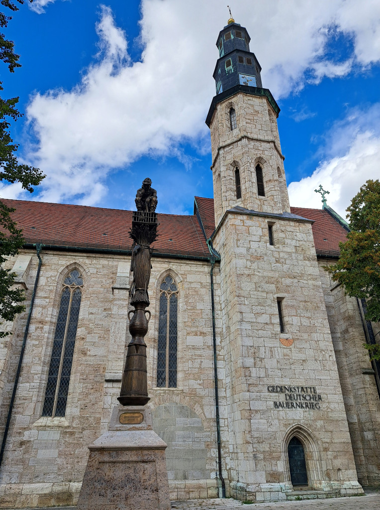 Kornmarktkirche. Hier befindet sich eine Station der Landesausstellung »freiheyt 1525 – 500 Jahre Bauernkrieg«.Philipp Bert, ein kompetenter und freundlicher junger Historiker und Lehrer, führte uns mehr als eine lang Stunde durch die Stationen des Bauernkriegs. Er erläuterte die Aufstände im Südwesten Deutschlands und jene in Thüringen, nannte das ungerechte Erbrecht damals als eine Ursache für den Unmut der Bauern und den Bauernkrieg als die erste freiheitliche Bewegung der deutschen Geschichte.