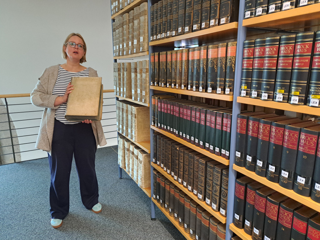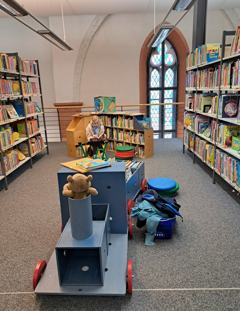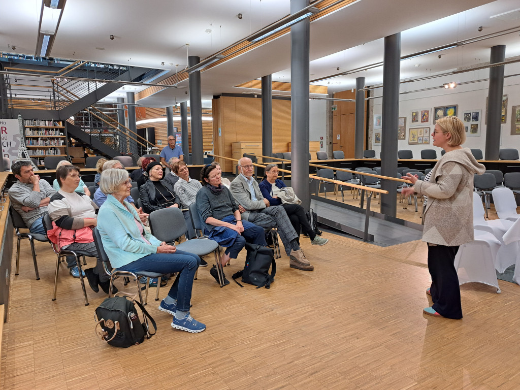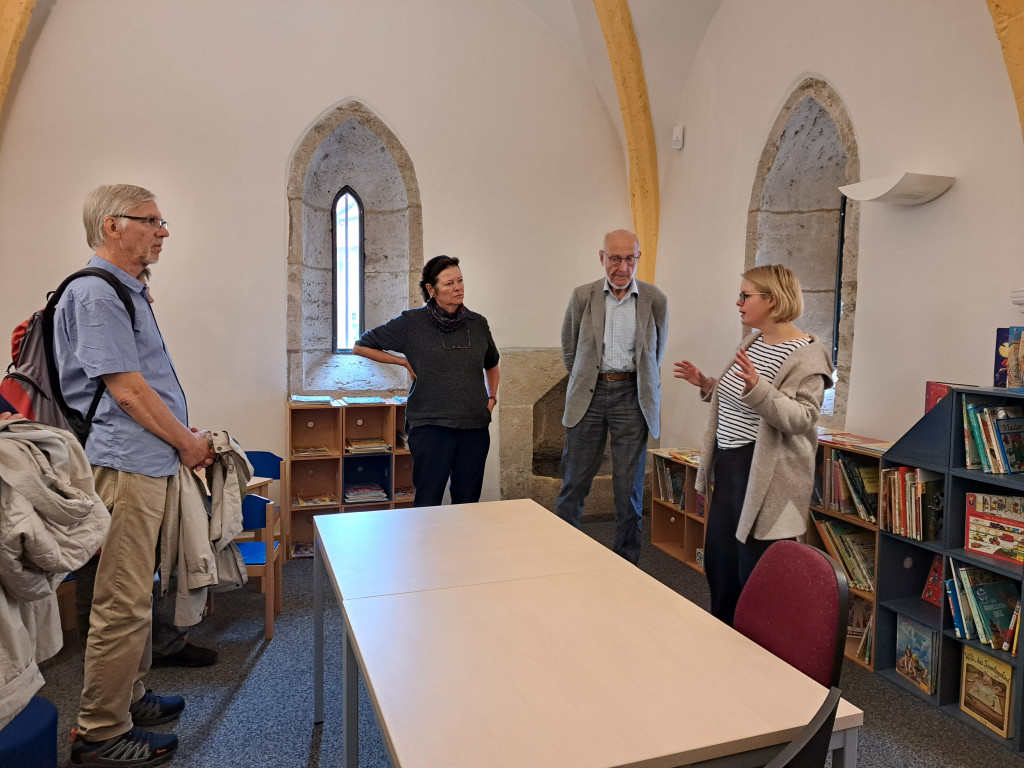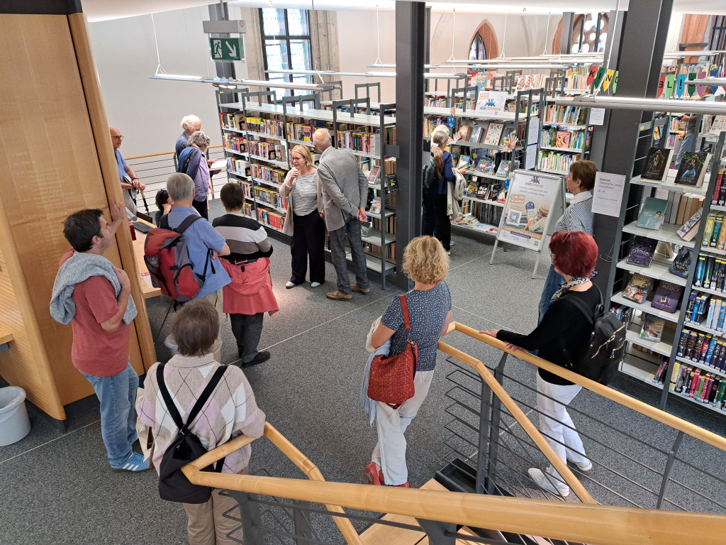 Sie zeigte uns auch einige archäologische Fenster in den Untergrund der Kirche. Wir sahen beispielsweise eine alte Grabplatte. Die Kirche umgab, wie meist, ursprünglich auch ein Friedhof.Heute gehört das Gebäude der Stadt Mühlhausen. Für die Bibliothek wurden drei Geschosse auf einem Gerüst aus Stahlsäulen eingezogen. Die Einrichtung ist aus sehr freundlich wirkendem hellen Holz. Rund sechs Millionen D-Mark hat der Umbau gekostet. Die Bibliothek bietet rund 70.000 Medien. Sie hat 5.000 Nutzerinnen und Nutzer, davon 1.000 aktive, erzählt Henrike Degenhardt. Hier finden Lesungen, Konzerte, Ausstellungen und sogar Trauungen statt.